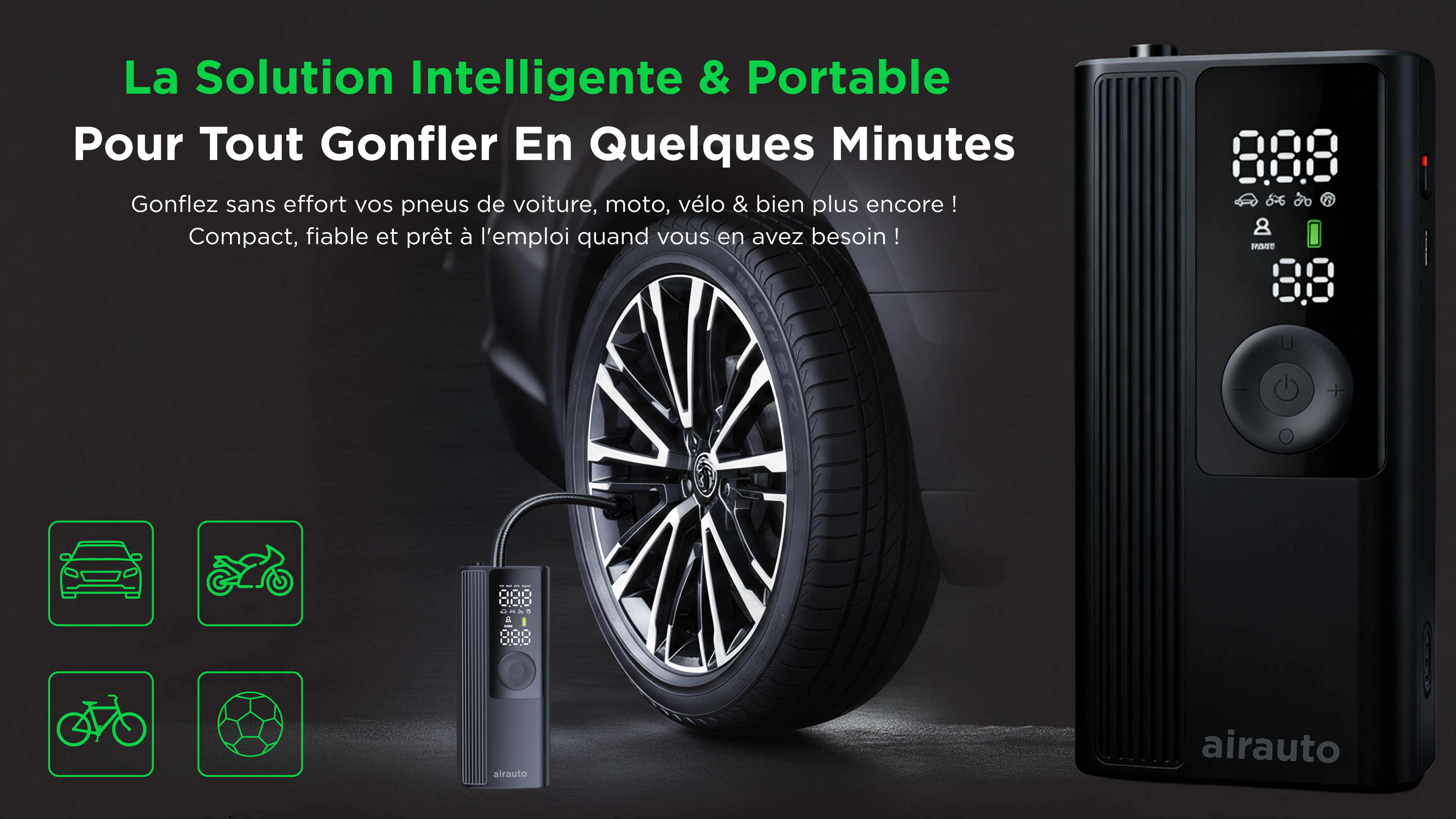 L'AirAuto est bien plus qu'un simple compresseur d'air : c'est la solution tout-en-un qui vous accompagne partout. Compact, puissant et ultra-polyvalent, il transforme chaque situation d'urgence en simple formalité. Que ce soit pour votre voiture, votre vélo, les ballons des enfants ou même votre trottinette électrique, l'Airmoto est toujours prêt à l'action.