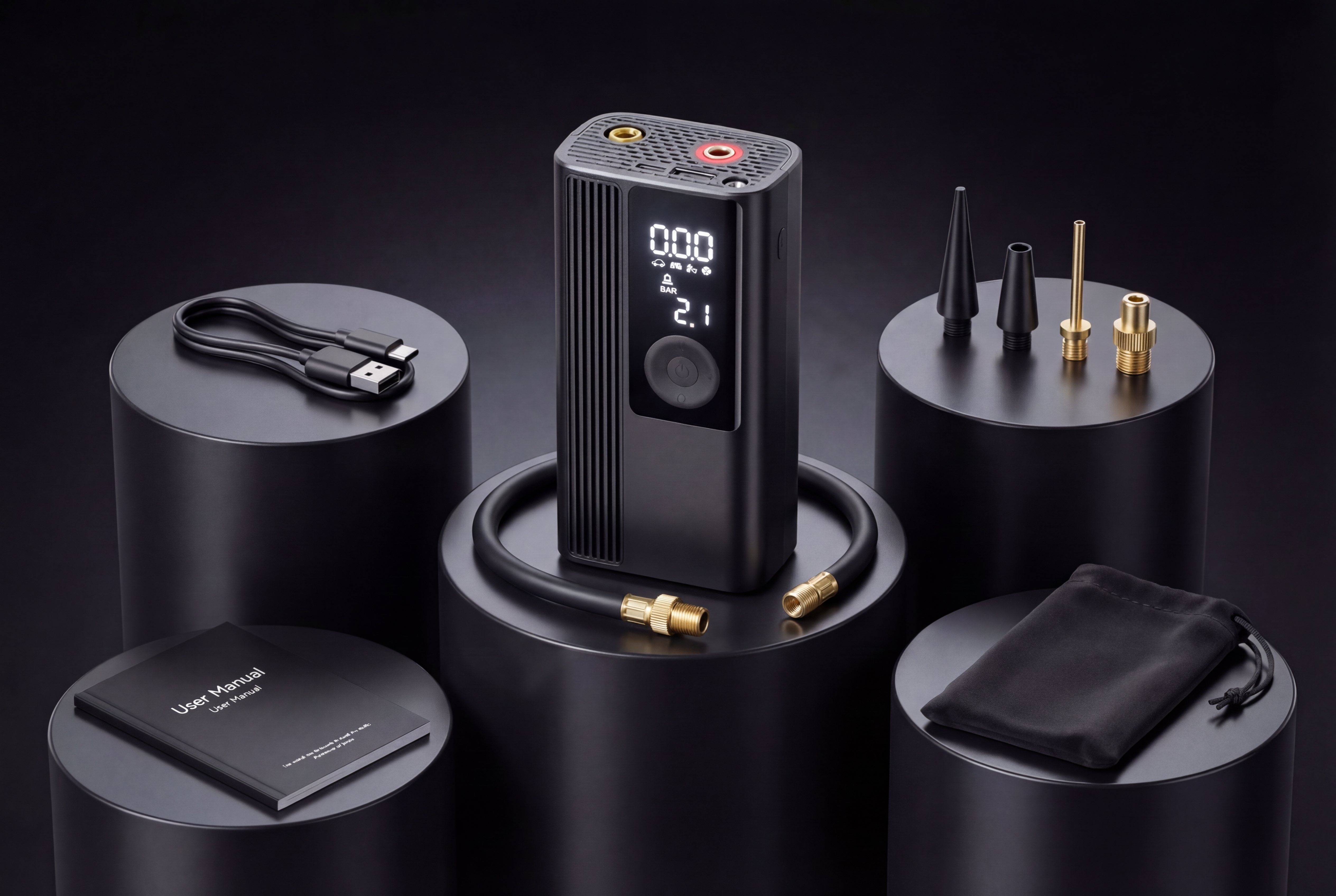 L'Air Auto arrive avec tous ses accessoires professionnels : câble de charge USB, 4 embouts universels (Schrader, Presta, aiguille, universel), manuel d'utilisation détaillé et housse de transport premium. Compact, organisé et toujours prêt à l'emploi. Glissez-le dans votre coffre et oubliez les galères de crevaison.