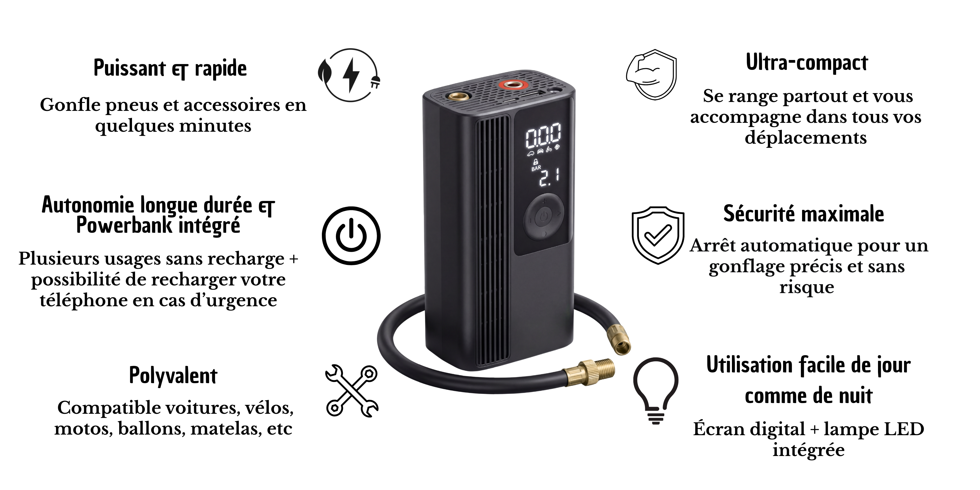 Franchement, super content de mon achat. Ça sert pour tout : voiture, vélo, ballons... C'est compact et ça marche nickel. Je pense en commander un autre pour l'offrir à mon père, avec sa moto il va adorer. Bon rapport qualité-prix, je recommande !